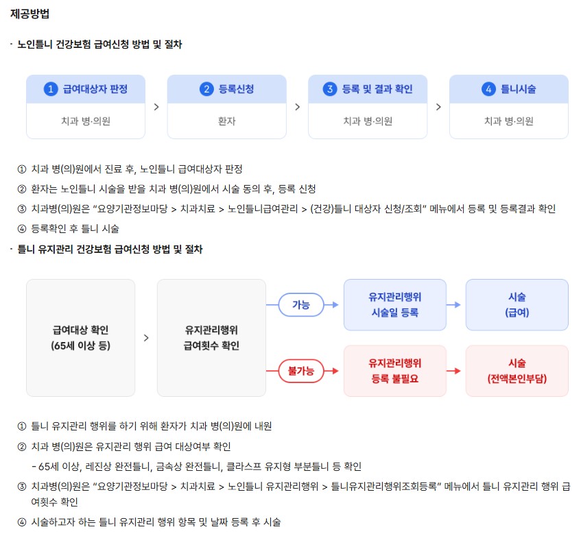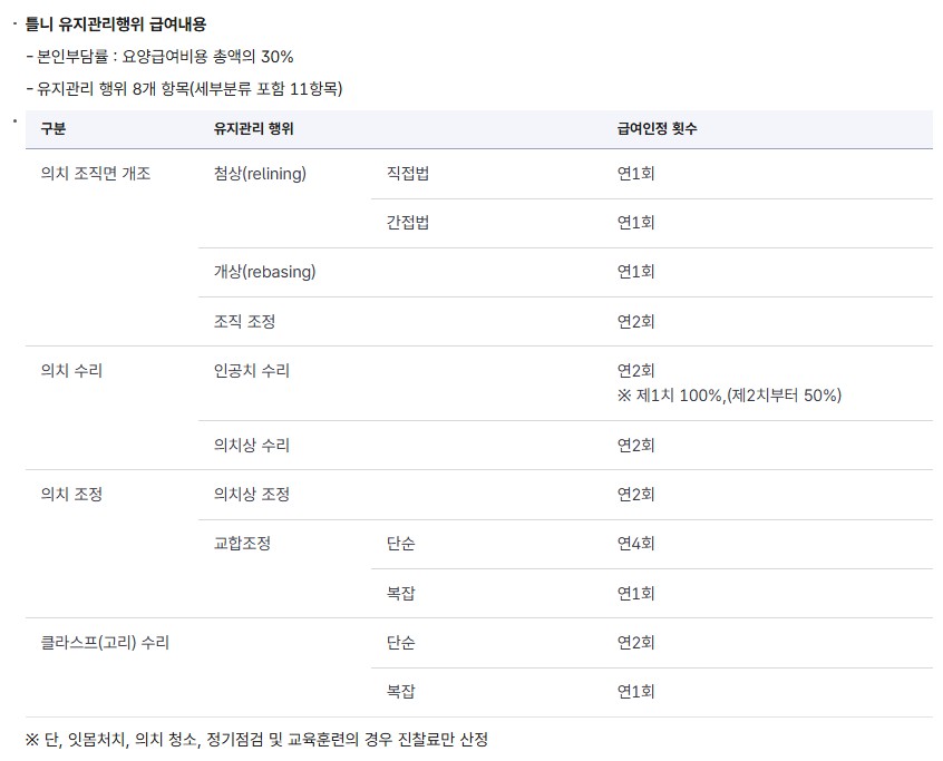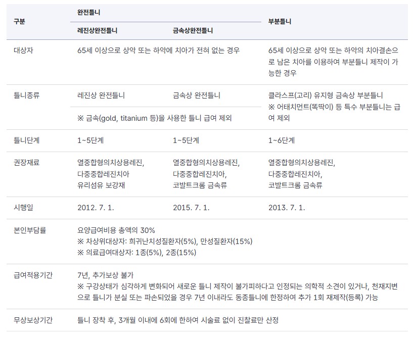 - 틀니 급여 주기: 동일 부위, 동일 종류 틀니는 7년(악당)마다 1회 지원
