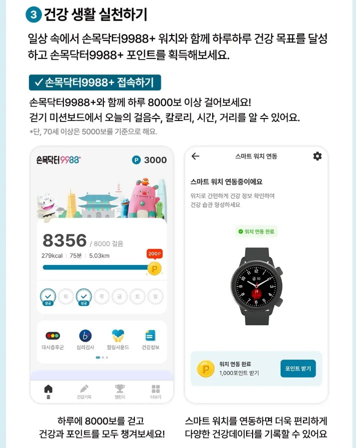 | 하루 8,000보 걷기 | 200포인트 | 70세 이상은 5,000보 기준 |