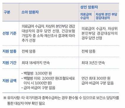 - 성인 암환자: 의료급여 수급자, 차상위 본인부담 경감 대상자, 건강ㅂ ㅗ ㅎ ㅓㅁ 가입자 중 소득·재산 조사 결과 추가 선정된 자.