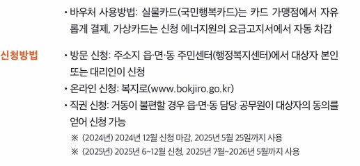 - 동절기: 전기·가스 등 요금차감형, 또는 국민행복카드(실물카드) 방식 선택 가능